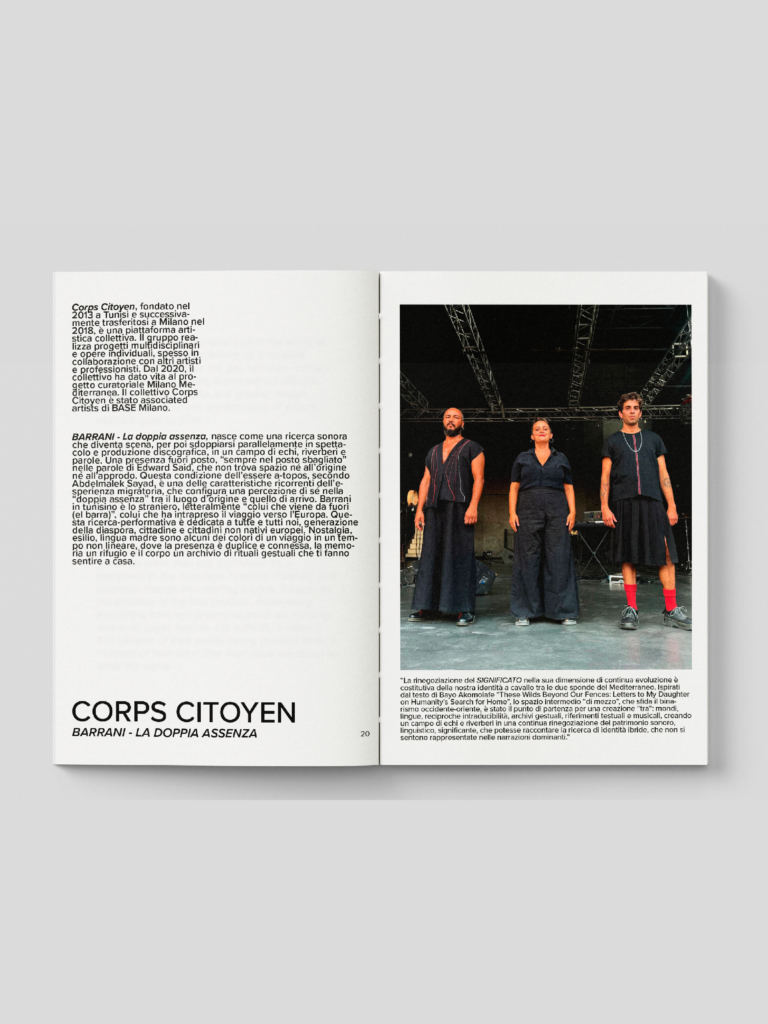 Durante il festival il collettivo Corps Citoyen ha presentato “BARRANI – La doppia assenza”, nato come ricerca sonora e divenuto scena, per poi sdoppiarsi in spettacolo e produzione discografica, in un campo di echi, riverberi e parole. “Barrani”, in tunisino, significa straniero, “colui che viene da fuori”: una presenza a-topos, sospesa tra origine e approdo, nella condizione della “doppia assenza” descritta da Sayad.